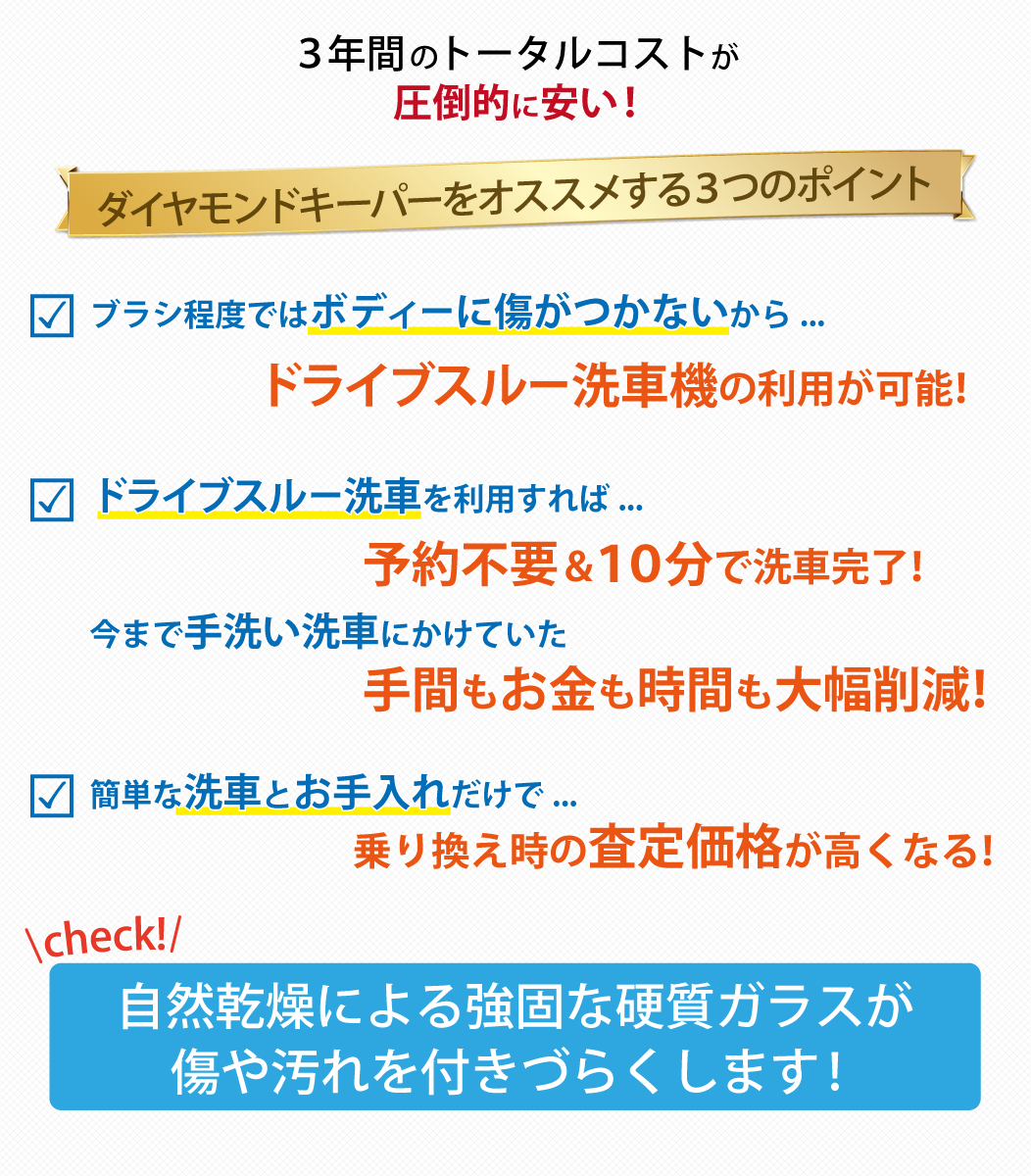最も大切にすべきなのは、「新鮮な塗装」です。自らが身代わりになって塗装を守ることがコーティング本来の役割だからです。